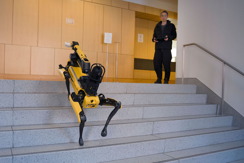 Students can gain additional experience by booking lab time with two iterations of Boston Dynamics’ Spot, another four-legged product, this one reminiscent of a yellow Labrador. An early model, popular with automakers and other manufacturers, was lent to the course by Latanya Sweeney, Daniel Paul Professor of the Practice of Government and Technology at Harvard Kennedy School. A newer version, now attached with an arm that resembles the long neck of a brontosaurus, was made available by Spot’s Waltham-based parent company. Additional hardware, and other supports, were provided by the Reischauer Institute of Japanese Studies.