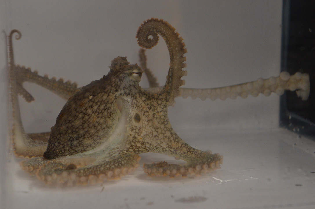 The scientists put male and female octopuses on either side of a black barrier in a saltwater tank. The divider contained small openings just wide enough for the arms.